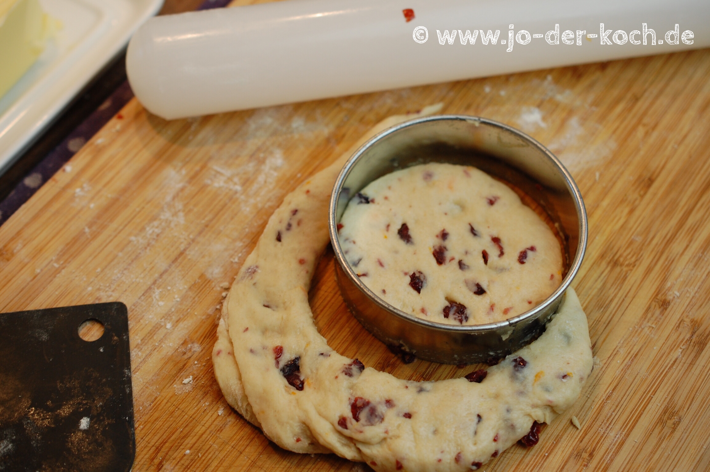 Ist alles zu einem Teig verrührt, müsst ihr das Ganze ca. 2-3 cm dick ausrollen und ausstechen. Zum Ausstechen könnt ihr entweder runde Ausstecher nehmen oder ihr benutzt einfach ein Glas. Den überschüssigen Teig natürlich wieder ausrollen und das Ganze wiederholen bis ihr keinen Teig mehr zum Ausrollen habt.